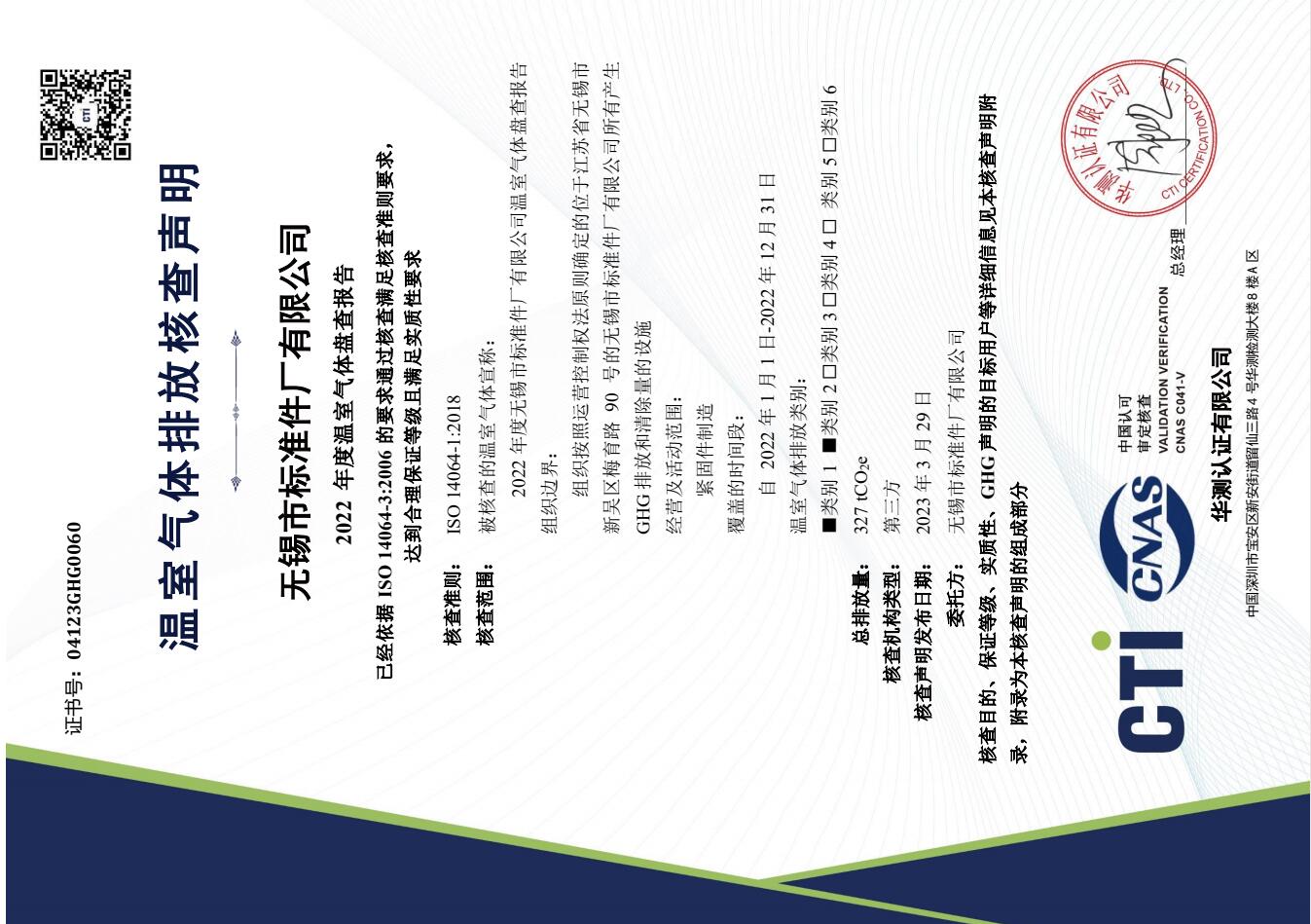 热烈庆祝公司荣获:“温室气体排放核查声明”证书